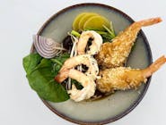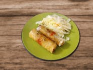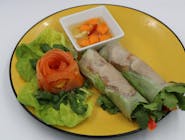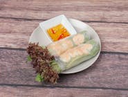 Sajgonki z krewetkami2 mini sajgonki z nadzieniem krewetkowym i krewetką w chrupiącej panierce. Podawane z surówką.