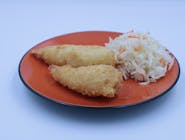 Kalmary chrupiące2 chrupiące kawałki lub 5 chrupiących krążków z kalmarów w panierce. Podawane z surówką.