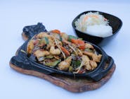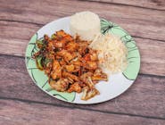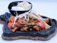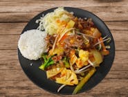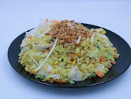 Tajski ryż smażonySmażony ryż biały w delikatnej paście krewetkowej. Z dodatkiem warzyw i jajkiem oraz dowolnym wybranym składnikiem. Podawany z surówką. Posypany prażoną cebulką.