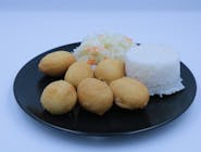 Kurczak w cieście dla dzieci4 kuleczki z piersią kurczaka w cieście kokosowym podawane z ryżem i surówką.