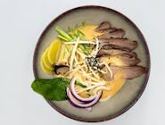 Sup Van ThanZupa z makaronem jajecznym, schabem, krewetkami, zapiekanymi pierożkami mięsnymi, sałata lodowa, jajkiem i ziołami.